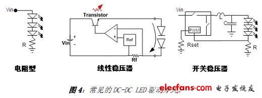 例如在采用DC-DC电源的LED照明应用中,可以采用的LED驱动方式有电阻型、线性稳压器及开关稳压器等,基本的应用示意图见图4。