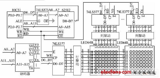 图1是高速控制方案LED显示屏电路原理。采用MCS51系列单片机对LED显示屏进行控制;随机存储器62512用作LED显示屏的数据存储器,存储待显示内容的字模数据;采用8行扫描方式,多片LED点阵片共用1组行驱动电路;每片LED点阵片都有一组列驱动电路,用74LS377作为列驱动的锁存器,CPU通过并行总线给列驱动电路的锁存器写字模数据;地址译码电路,用于产生LED点阵片行驱动电路和列驱动电路的片选地址。