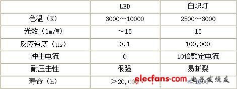 和白炽灯的相比较,LED在性能上具有很多优点,见下表: