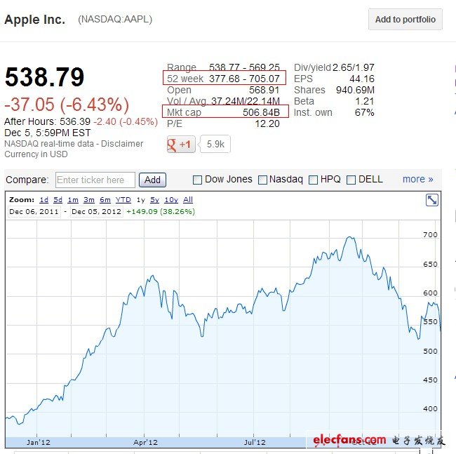 北京时间12月6日消息,据国外科技资讯网站CNET报道,对于苹果来说这几周特别难捱,其股价自9月中旬达到峰值后便一路下滑。周三美股收盘,苹果股价再次大跌,跌幅达6.43%,报收于538.79美元,总市值 5068.4亿美元。 在过去52周,苹果股价9月中旬达到历史最高点为705.07美元,总市值超过6600亿美元,与最高点相比,苹果股价已经下跌了23.58%,市值跌去近1600亿美元。