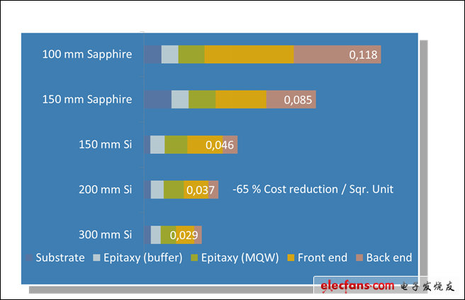 此外,生产复晶结构LED (flip chip LED)时,矽晶材质比蓝宝石更易移除,生产周期不仅可显著缩短,还能获得更佳的良率。LED厂商为了节省成本与生产时间 ,转为考虑使用大尺寸基板下,矽基板就占有相当好的优势。