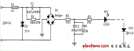 由于电容降压电源是一种非隔离式电源,在通电瞬间会产生很大的电流,也就是所谓的浪涌电流。此外,由于外界环境的影响如雷击的感应,从电网系统会侵入各种浪涌信号,有些浪涌会导致LED的损坏。而LED抗浪涌电流和抗反向电压能力都比较,加强这方面的保护也非常重要,尤其是有些LED灯装在户外,如LED路灯。因此LED驱动电源要有抑制浪涌的侵入,保护LED不被损坏的能力。本电路采用NTC(负温度系数热敏电阻)来限制电流的突变,利用PTC(正温度系数热敏电阻)自动调节电流大小使之趋于某个特定的变化范围,同时在电源输入端并有TVS(瞬态电压抑制器)以避免电压过载。