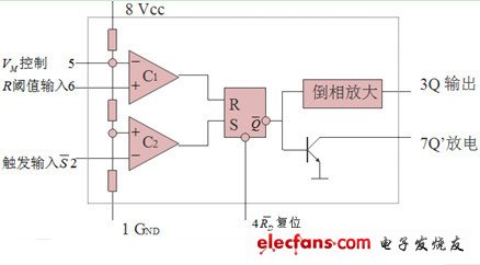 两个比较器C1和C2各有一个输入端连接到三个电阻R组成的分压器上,比较器的输出接到RS触发器上。此外还有输出级和放电管。输出级的驱动电流可达200mA。