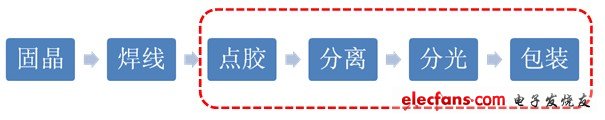 OB封装在生产流程上和传统SMD生产流程基本相同,在固晶,焊线流程上和SMD封装效率基本相当,但是在点胶,分离,分光,包装上,COB封装的效率,要比SMD类产品高出很多,传统SMD封装人工和制造费用大概占物料成本的15%,COB封装人工和制造费用大概占物料成本的10%,采用COB封装,人工和制造费用可节省5%。