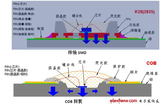 传统SMD封装应用的系统热阻为:芯片-固晶胶-焊点-锡膏-铜箔-绝缘层-铝材。COB封装的系统热阻为:芯片-固晶胶-铝材。COB封装的系统热阻要远低于传统SMD封装的系统热阻,大幅度提高了LED的寿命。