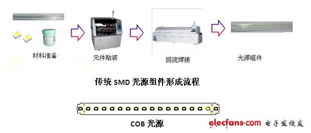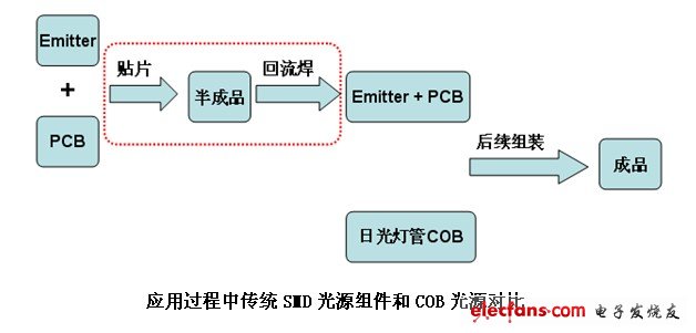 从上图可以看出COB光源在应用端省去了贴片和回流焊的流程,大幅度降低了应用端生产和制造流程,同时可省去相应的设备,生产制造设备投入成本更低,生产效率更高。