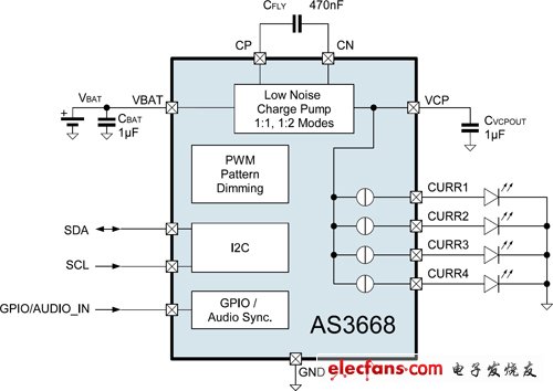 AS3668是一款基于充电泵的高效可编程LED驱动芯片,可为每个LED提供高达25mA的精确电源,当配合RGB/W(红、绿、蓝、白)LED组时能产生多种精致光效。