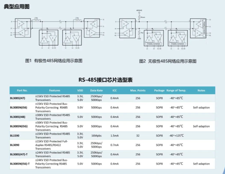 上海贝岭RS-485接口芯片种类丰富,包括有极性485和无极性485系列产品。这些芯片的最高数据传输速率在250kbps至16Mbps之间,客户可以根据具体的应用场景进行选择。