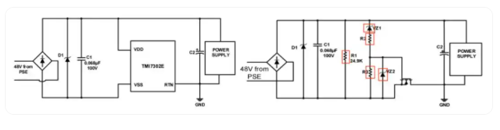 TMI7302E跟非标方案对比外围减少了三个电阻和两个稳压管,外围更简洁,PCB占有面积更小。