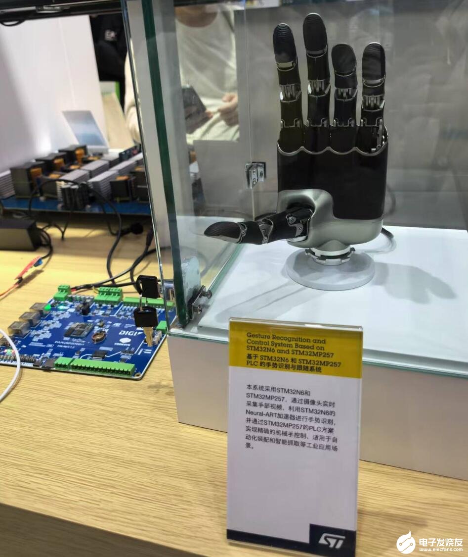 基于STM32N6和STM32MP257 PLC 的手势识别与跟随系统采用了STM32N6和STM32MP257,通过摄像头实时采集手部视频,并利用STM32 N6的Neural-ART加速器进行手势识别。“这款展品可以做手部的21个点精准识别,里面跑了两个算法,一个是识别手掌,二是对21个手部精准点追踪,正面侧面反转等。通过扩展的网关,它还可以控制灵巧手,因而对人手势动作进行模仿。” 丁晓磊表示,“这个方案不仅适用于自动化装备和智能抓取等工业应用场景,还可以扩展到家电控制上。”