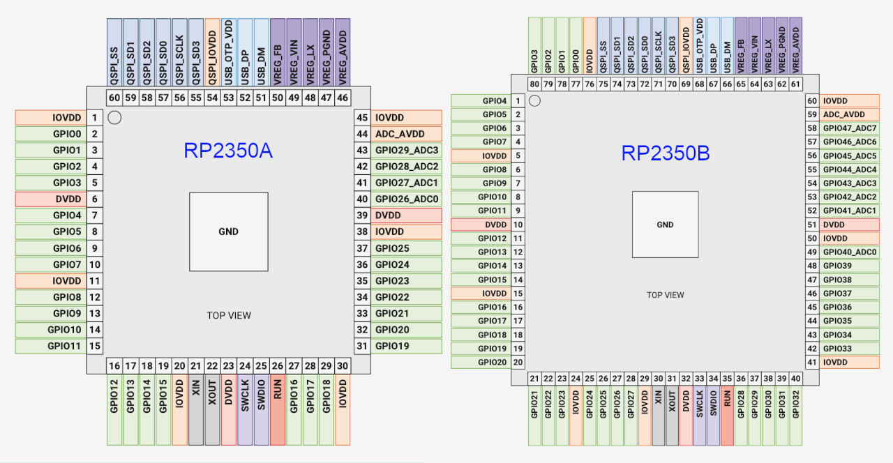 RP2350 分为 A 和 B 两个型号,主要区别在于封装尺寸、引脚数量和 GPIO 数量: