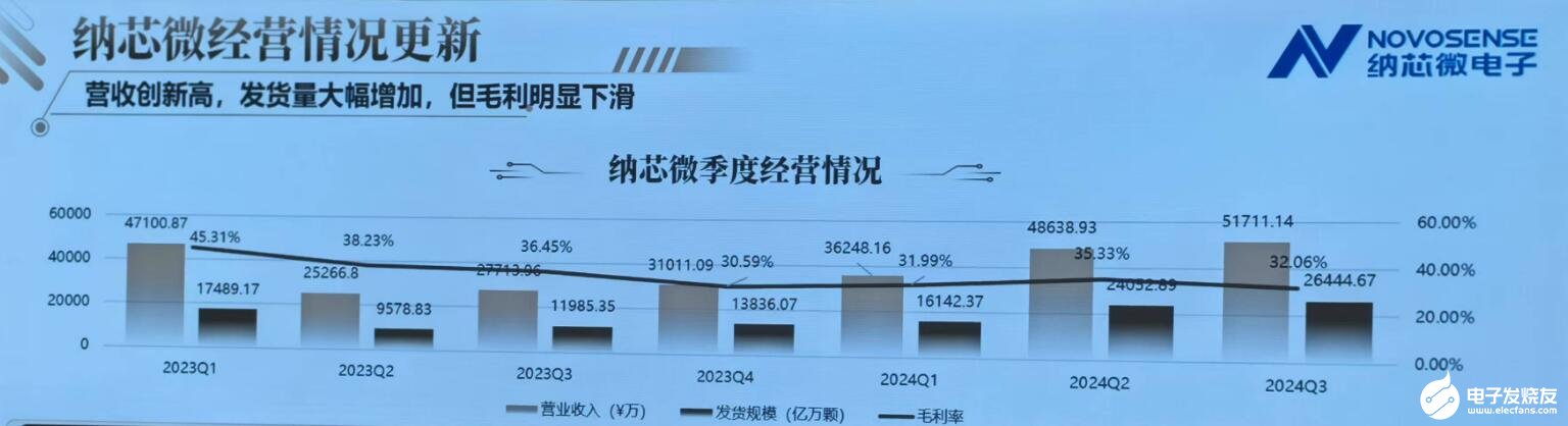 纳芯微CEO王升杨分析说:“整个营收恢复增长的过程十分艰辛,结合发货量来看,2024年第三季度发货量相比2023年第一季度发货量增加了约50%,但是因为激烈市场竞争带来的毛利下降,营收只增加了约10%。值得庆幸的是,我们在激烈的市场竞争中守住了甚至扩大了市场份额,挑战是毛利率、利润经历了大幅度下降。”