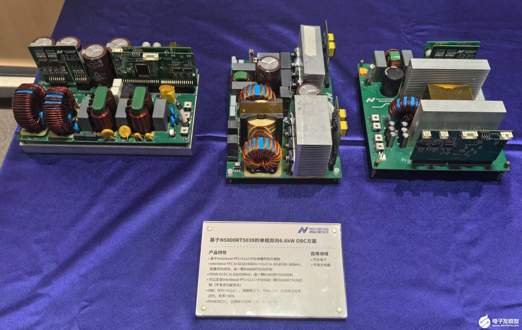 在媒体沟通会的Demo展区,记者看到了基于NS800T5039的单相双向6.6kW OBC方案和基于NS800RT5049的电机控制器展示。前者的方案主要应用在汽车电子和车载充电器领域,可以实现Interleave PFC +CLLC +PSHB由一颗NS800RT5039控制,OBC(PFC+CLLC),满载情况下,THD小于3%,达到峰值效率点时,效率大于96%。