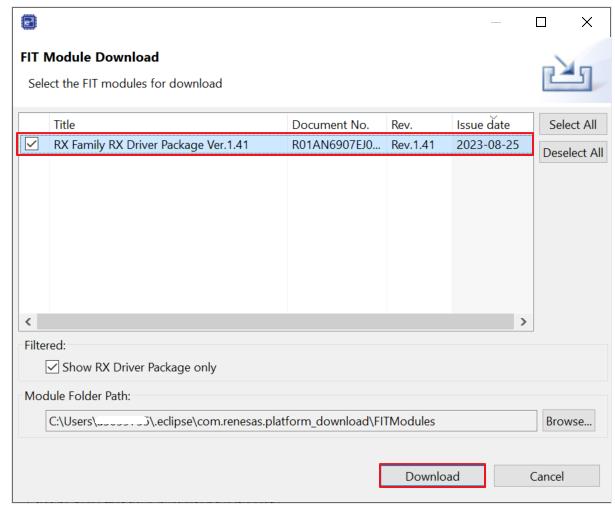 网络好时可以勾选RX Family RX Driver Package Ver1.41,并点击Download。也可以使用FITModules.zip文件,解压到Module Folder Path。