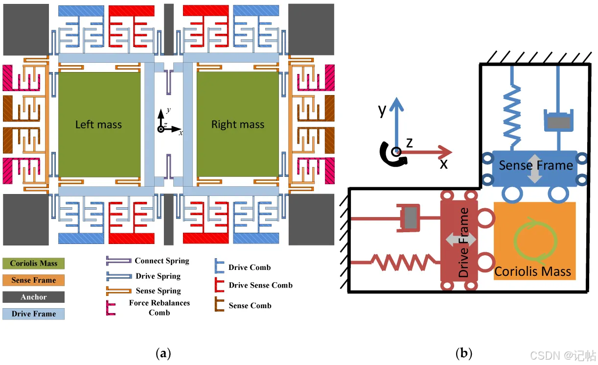 两个相同的质量块以方向相反的做水平震荡。当外部施加一个角速率,就会出现一个科氏力,力的方向垂直于质量运动方向,如垂直方向箭头所示。产生的科氏力使感测质量发生位移,位移大小与所施加的角速率大小成正比,科氏力引起的电容变化即可计算出角速率大小。