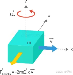 科里奥利效应指出,当质量 (m) 以速度 (v) 沿特定方向移动并施加外部角速率 (Ω)(红色箭头)时,科里奥利效应会产生一个力(黄色箭头),导致质量垂直移动。该位移的值与应用的角速率直接相关。