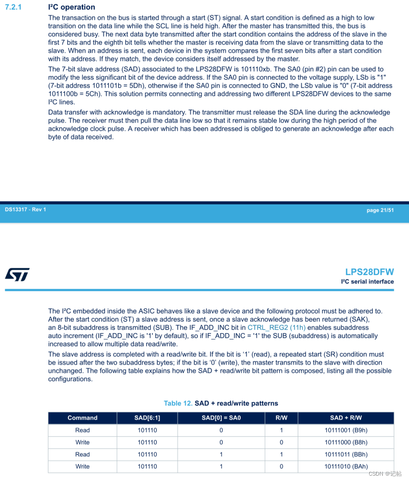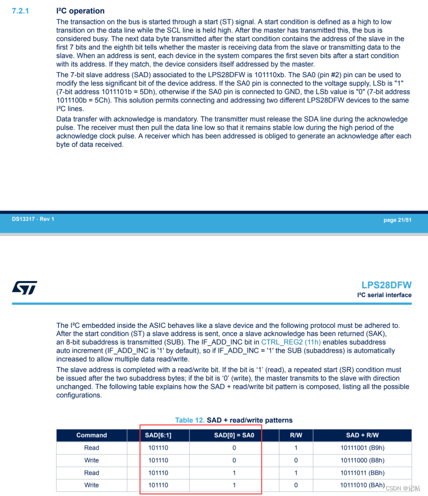 查看手册,可以得知LPS28DFW的IIC地址为“1011100” 或者 “1011101”,即0x5C或0x5D。
