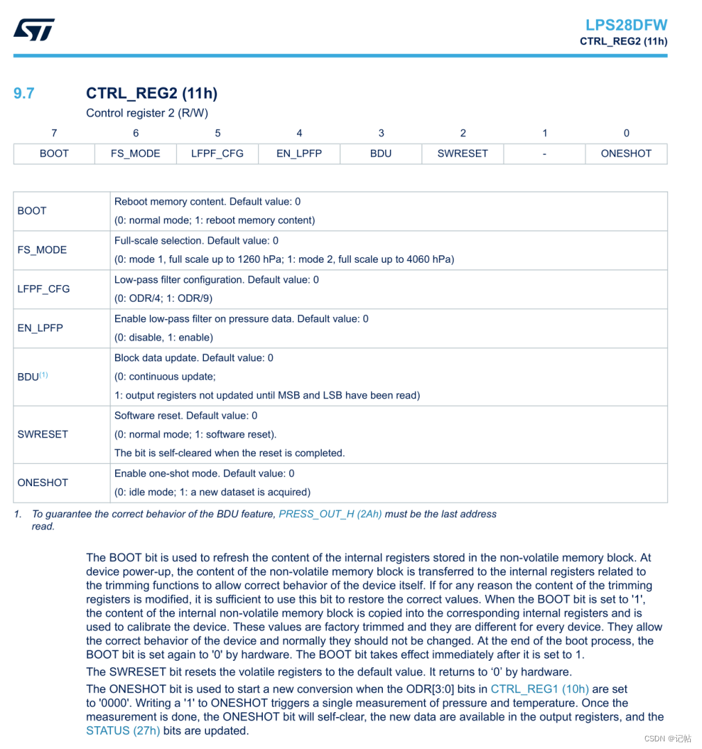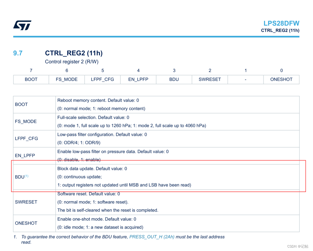 连续更新模式(BDU = '0'):在默认模式下,输出寄存器的值会持续不断地被更新。这意味着在你读取MSB和LSB的时候,寄存器中的数据可能会因为新的测量数据而更新。这可能导致一个问题:当你读取MSB时,如果寄存器更新了,接下来读取的LSB可能就是新的测量值的一部分,而不是与MSB相对应的值。这样,你得到的就是一个“拼凑”的数据,它可能无法准确代表任何实际的测量时刻。
