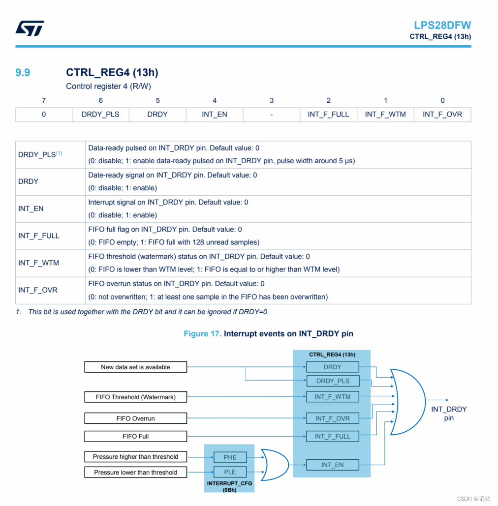 CTRL_REG4 (13h) 寄存器在 LPS28DFW 气压传感器中用于控制与中断相关的不同功能。以下是具体的位字段及其功能: