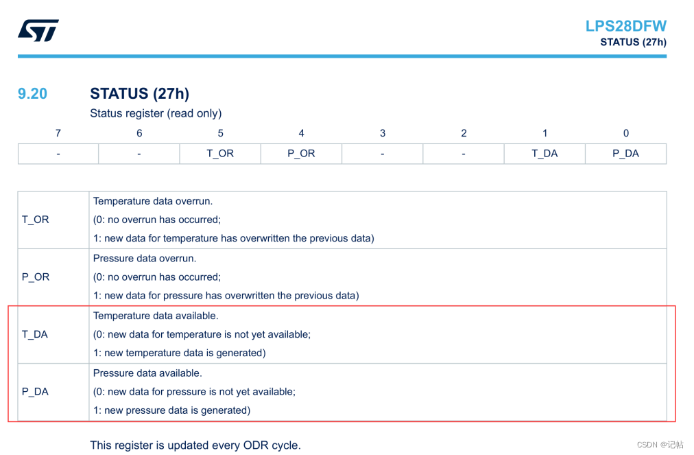对于压强和温度数据是否准备好,可以查看STATUS (27h)的Zyxda位,判断是否有新数据到达。