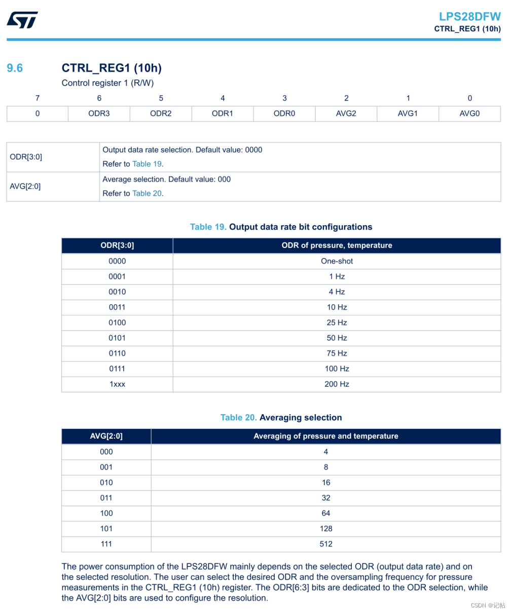 对于 LPS28DFW 气压传感器,CTRL_REG1(10h)和 CTRL_REG2(11h)的主要设置如下: