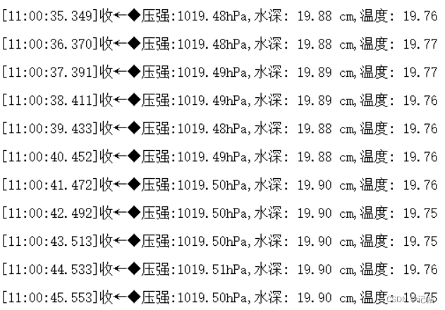 while(1) { /* Read output only if new values are available */ lps28dfw_all_sources_get(&dev_ctx, &all_sources); if ( all_sources.drdy_pres | all_sources.drdy_temp ) { lps28dfw_data_get(&dev_ctx, &md, &data); if(i==0) { open_h =data.pressure.hpa; printf("first pressure:%6.2fhPa,temperature:%6.2frn",open_h,data.heat.deg_c); i++; } else { float h; h=(data.pressure.hpa-open_h)/(1000*9.8);//水深=压强/(水密度*重力加速度) //1百帕 (hPa)= 100 Pa = 1 mbar1千帕 (kPa)= 1000 Pa = 10 hPa printf("pressure:%6.2fhPa,h:%6.2f cm,temperature:%6.2frn",data.pressure.hpa,h*100*100,data.heat.deg_c); } } }