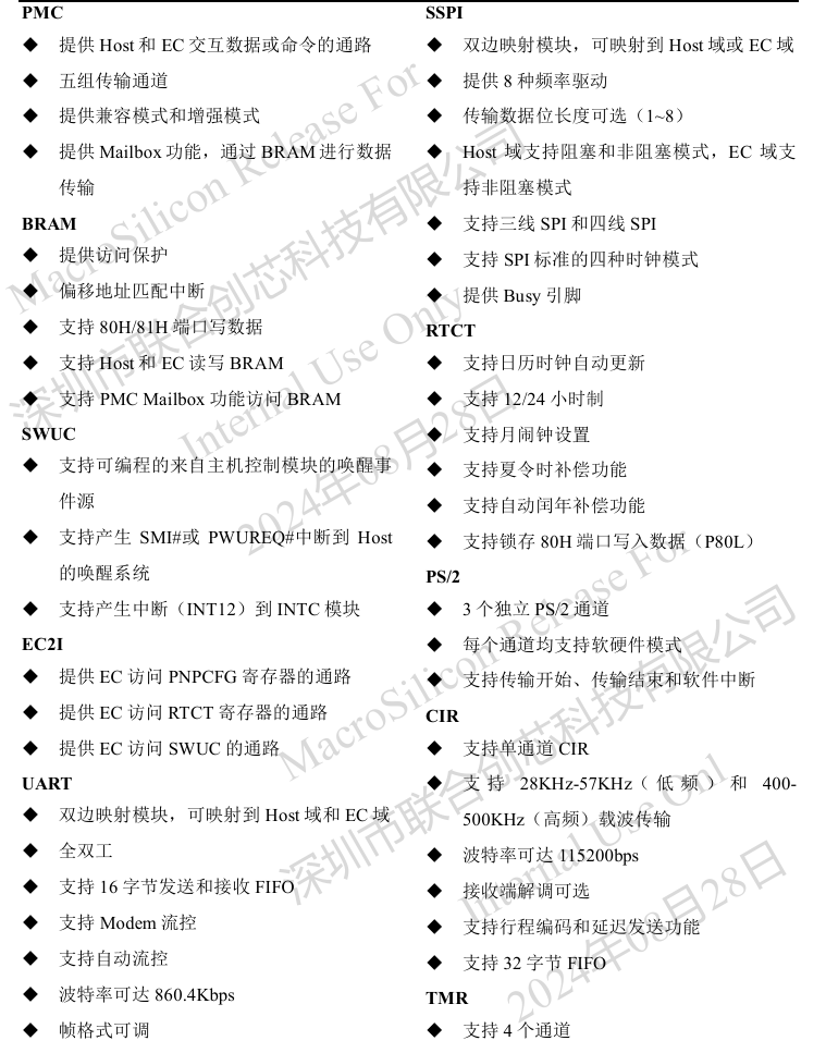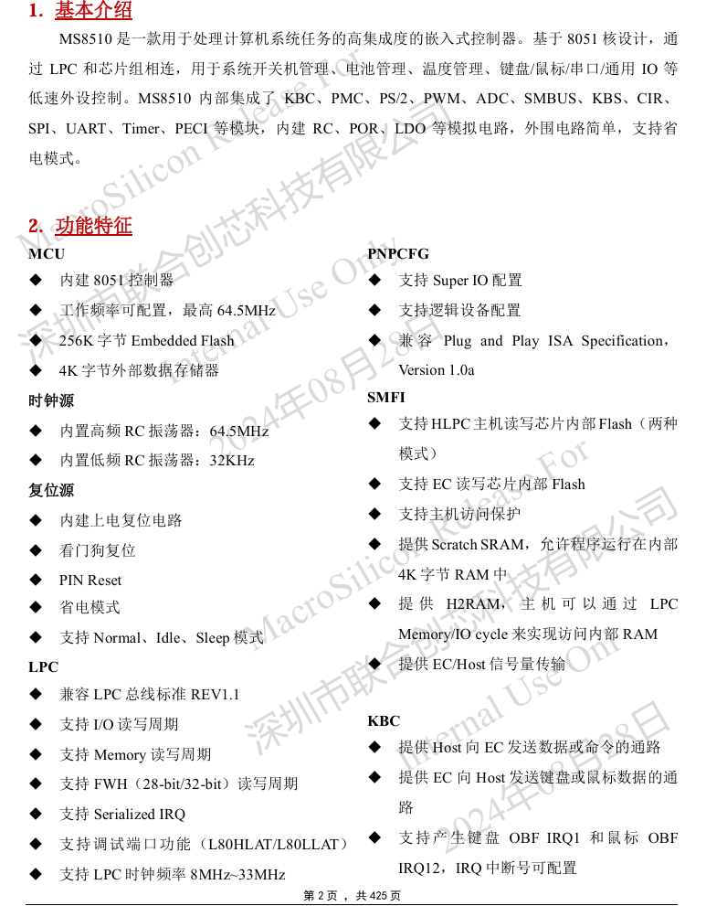 基本介绍MS8510是一款用于处理计算机系统任务的高集成度的嵌入式控制器。基于8051核设计,通过LPC和芯片组相连,用于系统开关机管理、电池管理、温度管理、键盘/鼠标/串口/通用IO等低速外设控制。MS8510内部集成了KBC、PMC、PS/2、PWM、ADC、SMBUS、KBS、CIR、SPI、UART、Timer、PECI等模块,内建RC、POR、LDO等模拟电路,外围电路简单,支持省电模式。