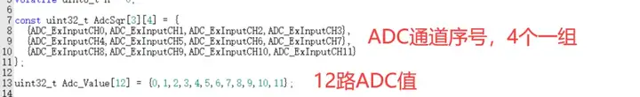 12路ADC通道划分为3组,每组4个通道,DMA搬运次数设置为4次;