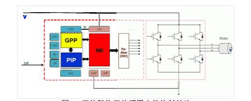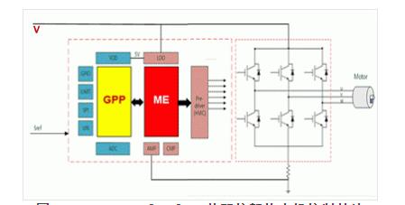 单核架构的电机控制芯片只能在串行处理模式下进行多任务计算,越来越难以适应现代产品的挑战。因此,Fortior Technology 等公司纷纷开发出双核架构的电机控制芯片。图 7 显示了其采用双核架构的无刷直流电机控制芯片3。该芯片由一个专用内核电机引擎 (ME) 和一个通用内核通用处理器 (GPP) 组成。ME 侧重于观察者和电机控制模式的算法,而 GPP 用于处理通信、保护和闭环控制等通用任务。