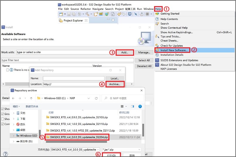 - 打开S32DS 3.4,进入菜单栏“Help”->“Install New Software”,按下图步骤添加安装包。