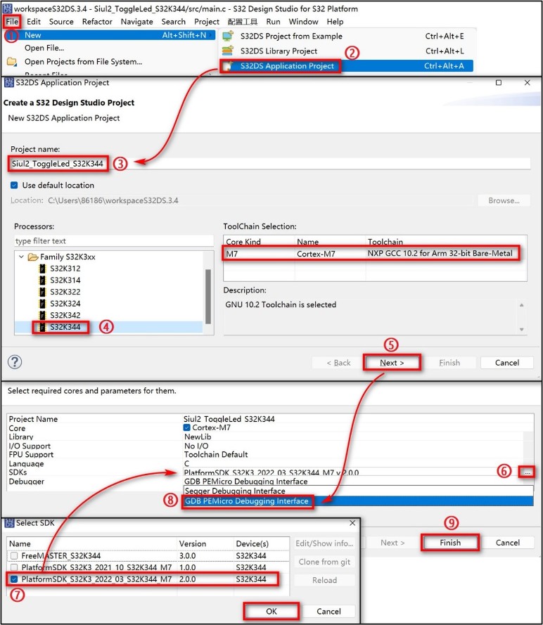 - 创建工程并输入工程名,选择芯片型号以及编译器版本,根据Release Note文档的描述,我们需要使用2版本的GCC。 SDK 选择“PlatformSDK_S32K3_2022_03_S32K344_M7 v2.0.0”, Debugger选择你使用的调试器,我这里使用 PEMicro,最后点击“Finish”工程就创建好了。