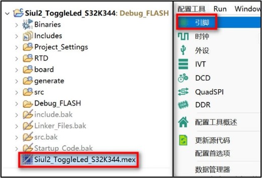 - 下图所示为创建好的工程,双击“.mex” ,或者在菜单栏找到“配置工具”并点击“引脚”。