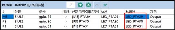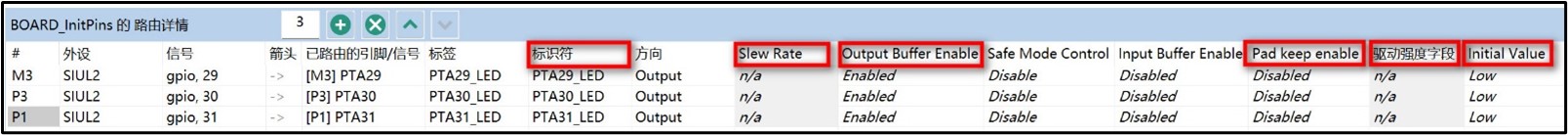 - 配置每个引脚的功能和属性,我们使用大联大世平集团基于 S32K344 的最小系统开发板,其中 RGB 小灯使用 PTA29/30/31 分别控制红/绿/蓝三种颜色,将这三个引脚复用配置为“SIUL2,gpio”模式,方向选择“output”,初始值均设为“Low”。