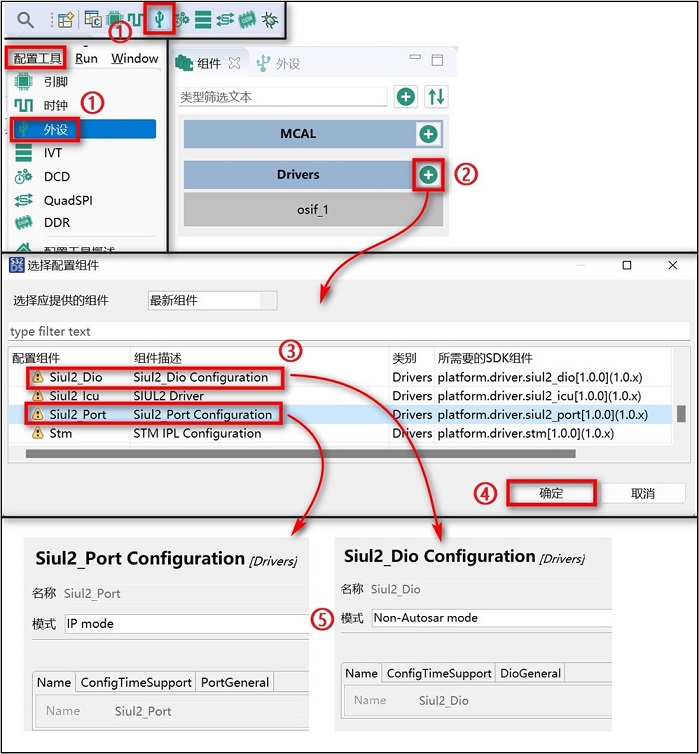- 点击界面右上角的“外设”按键或者在菜单栏找到“配置工具”并点击“外设”,按下图步骤添加 Siul2_Port 和 Siul2_Dio 两组外设驱动模块,进行 SDK 外设驱动程序的初始化配置。