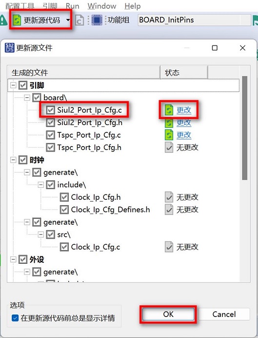 - 点击“更新源代码”生成引脚配置代码,你可以点击“更改”来查看生成代码的更新,并勾选你想要更新的文件。