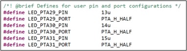 - 在< Siul2_Port_Ip_Cfg.h > 中我们可以找到下图所示的宏定义,这是因为我们在配置 I/O 属性时,在标识符字段填写了引脚 ID。那“PTA_H_HALF”是什么意思呢,为什么 PTA29 的 PIN 设为 13?