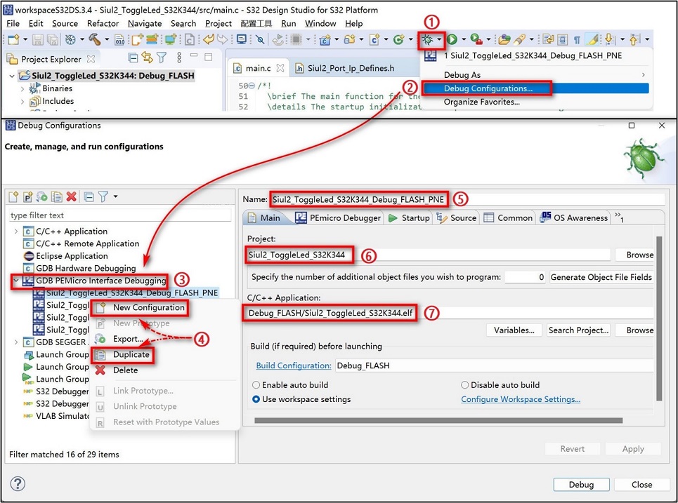 - 如下图打开调试配置窗口。如果没有出现可参照的调试目标,右键 “GDB PEMicro Interface Debugging”选择“New Configuration”新建调试目标;如果有参考目标可以右键目标选择“Duplicate”。为工程重命名,并将Main窗口中的elf文件路径配置到工程路径。