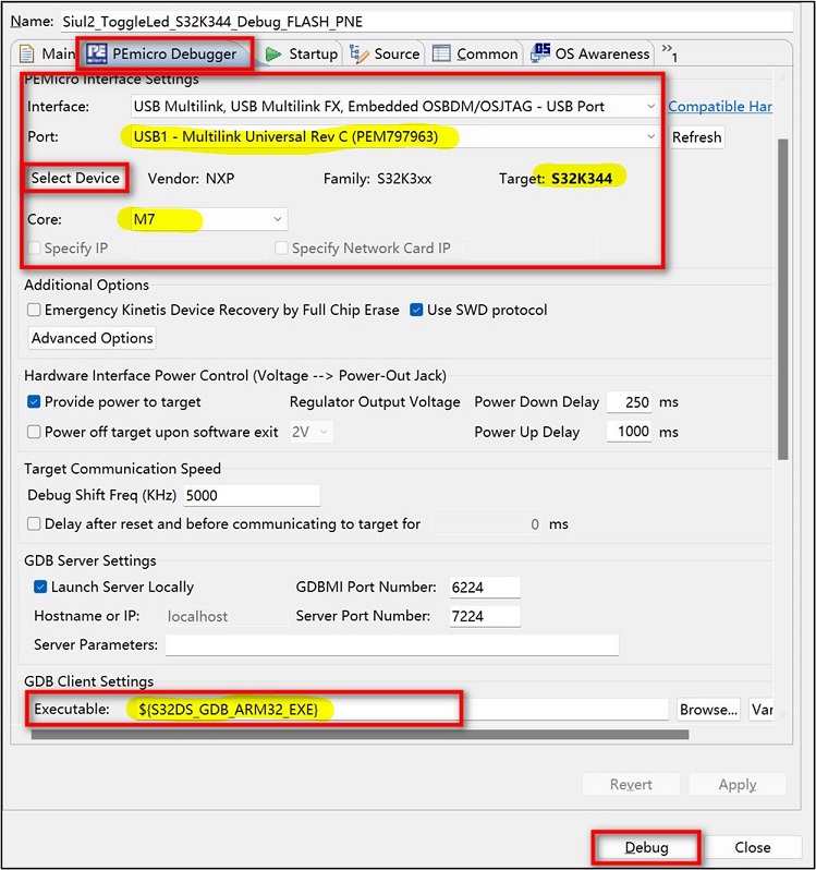 - 切换至“PEmicro Debugger”标签页,将Executable设置为“${S32DS_GDB_ARM32_EXE}”,并选择好调试器接口和芯片型号,建议无论是不是新建的都要将这几个地方检查一遍,如下图。当Port口读到下图信息,代表Multilink已经连接到开发板上。进入debug页面,并点击绿色运行按键