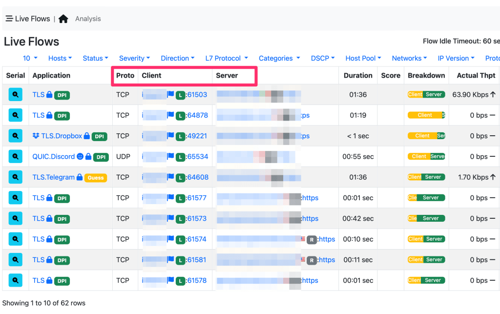 可以配置ntopng(通过首选项)和nProbe(使用带有-t和-d的命令行)流超时,因此这些问题得到了缓解(尽管没有完全解决)。然而,仅仅调整超时是不够的,特别是对于UDP流,因为与TCP相反,没有TCP标志可以用来猜测真实的流方向。因此,ntopng实现了一些启发式来交换流向,但这种启发式不能太激进,因为我们可能会报告无效信息。