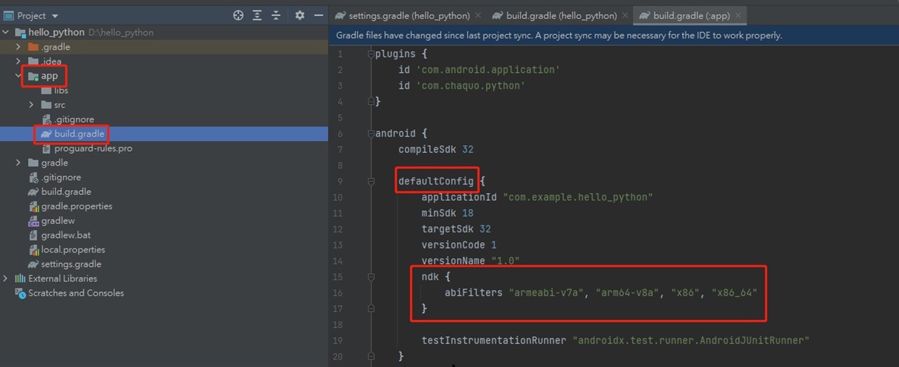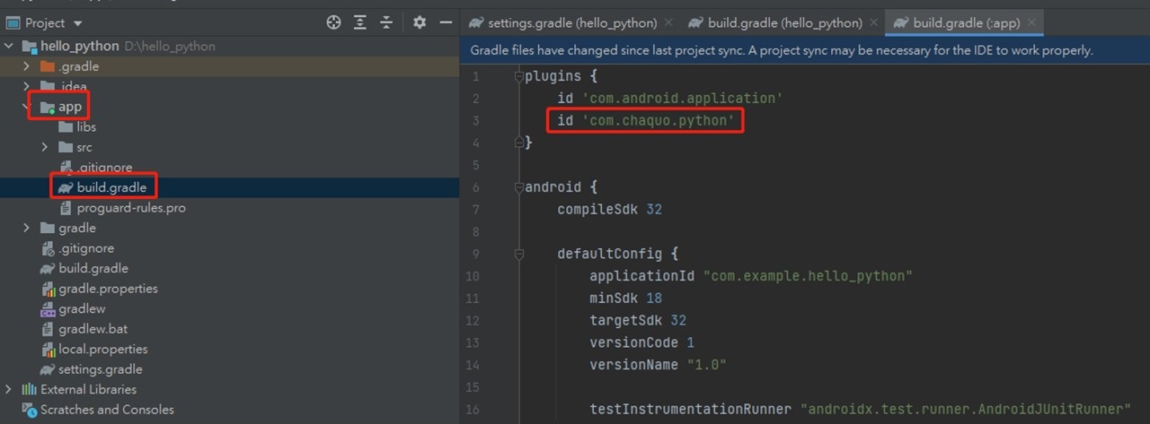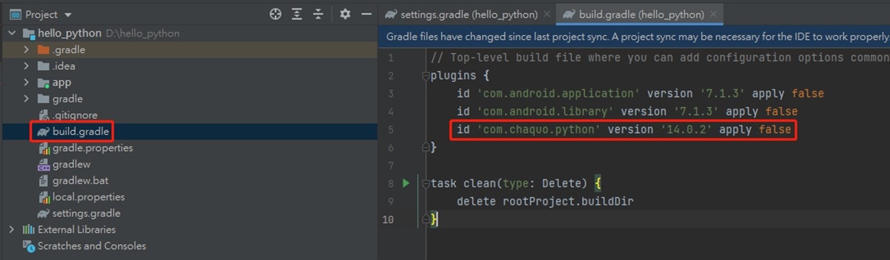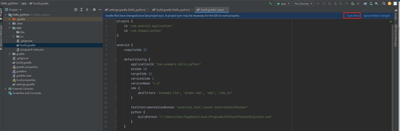 f. 最后Android Studio画面上会出现提示框,点击Sync Now就可进行同步,完成之后,Chaquopy套件就成功加入项目内了。(图6)