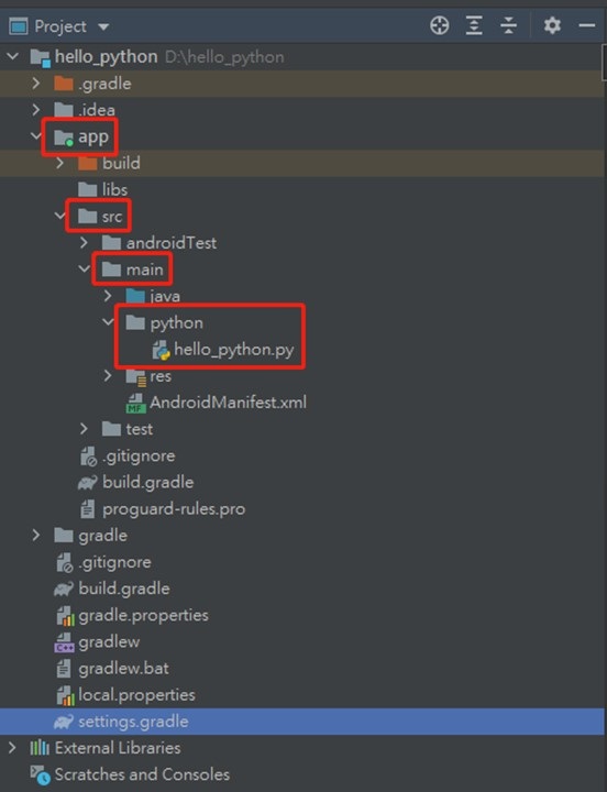 a. 在app内àsrcàmain新增python资料夹,资料夹内在新增一个hello_python.py档案。(图7)