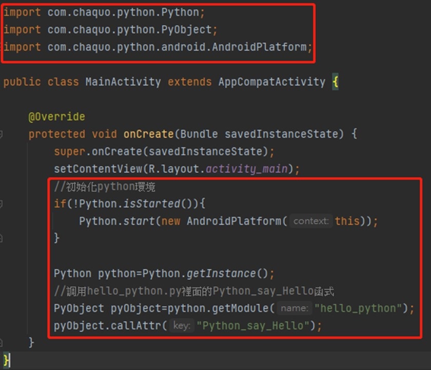 import com.chaquo.python.Python;import com.chaquo.python.PyObject;import com.chaquo.python.android.AndroidPlatform; //初始化python环境if(!Python.isStarted()){ Python.start(new AndroidPlatform(this));}Python python=Python.getInstance();//调用hello_python.py里面的Python_say_Hello函式PyObject pyObject=python.getModule("hello_python");pyObject.callAttr("Python_say_Hello");