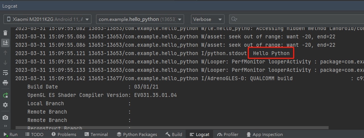 d. 最后执行Run app既可成功使用,可以在Logcat中看到python输出。(图9)