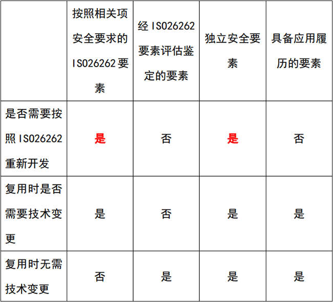 ISO26262给出了四种情况来描述不同的硬件或软件的认证状态类型,如下表所示,设计者或用户可以根据需要选择要开发或者评估相应的要素。