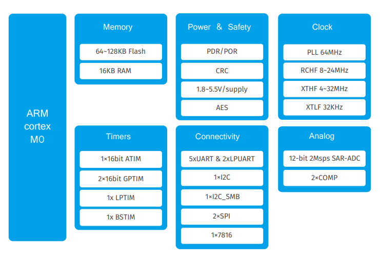 该系列MCU是基于ARM Cortex-M0内核的32位低功耗MCU芯片,最高主频为64MHz,提供最大128KB FLASH程序存储空间,搭配 16KB RAM;片上集成LCD驱动、带温补的RTC、SAR-ADC、AES加密,以及丰富的通用外设接口;支持多种封装形式,包括:LQFP64/ LQFP48/ QFN32/ TSSOP24. 其主要特性如下: