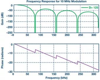 在图 2 中,绕组分流器用于测量电机绕组电流,隔离式 ADC 用于在隔离栅上传输 10 MHz 数据流。Sinc 滤波器可将高分辨率电流数据提交给电机控制算法,该算法会计算施加所需逆变器电压需要的逆变器占空比。另一个低分辨率滤波器可检测电流过载,并在出现故障时将跳变信号发送至 PWM 调制器。Sinc 滤波器频率响应曲线解释说明了合适的参数选择如何能够使滤波器抑制电流采样中的 PWM开 关纹波。