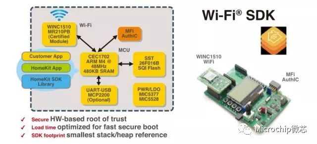 完整开发套件包含SecureIoT演示板(CEC1702, Arm® Cortex®-M4和DM990012)搭配Wi-Fi 7 Click (WINC1510, IEEE 802.11 b/g/n, MIKROE-2046)加上Apple认证IC(另购)(图6)。得到Apple授权详细流程请至MFi (Made For iPod) Program官方网站了解与申请,在此不再赘述。Microchip仅提供MFi授权持有者的HomeKit Wi-Fi SDK,如有相关问题请电邮至:applesupport@microchip.com,并注明您的MFi授权编号、公司名称、联系人姓名、地址及电话,便于我们尽快为您提服务。