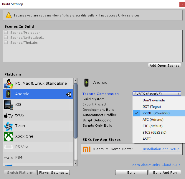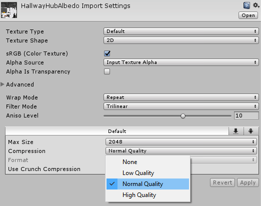 Unity支持各种各样的纹理压缩方法,默认方法是ETC,当然你也可以选择其他方法,如下图所示: