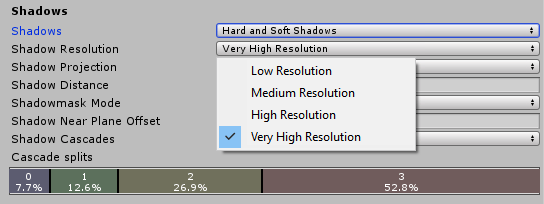 如下图所示阴影分辨率也可以根据每个光来设置,各自的光阴影分辨率总是优先于全局的质量设置,除非选择使用“Use Quality Setting”选项。