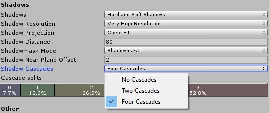 如果相机角度允许并且级联设置不会覆盖很多区域的话,适当调整阴影级联的数量也是一个很好的主意。这种情况下,你可以降低级联的数量,从4降到2或者没有级联。